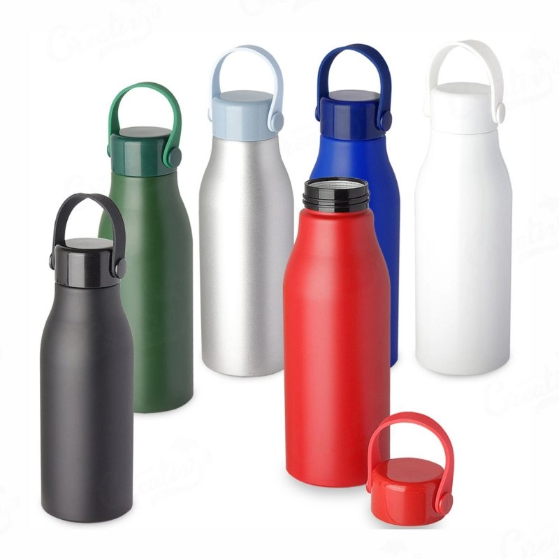 Garrafa em alumínio, tampa em plástico com alça na cor do produto. Capacidade de 550ml, pintura fosca.