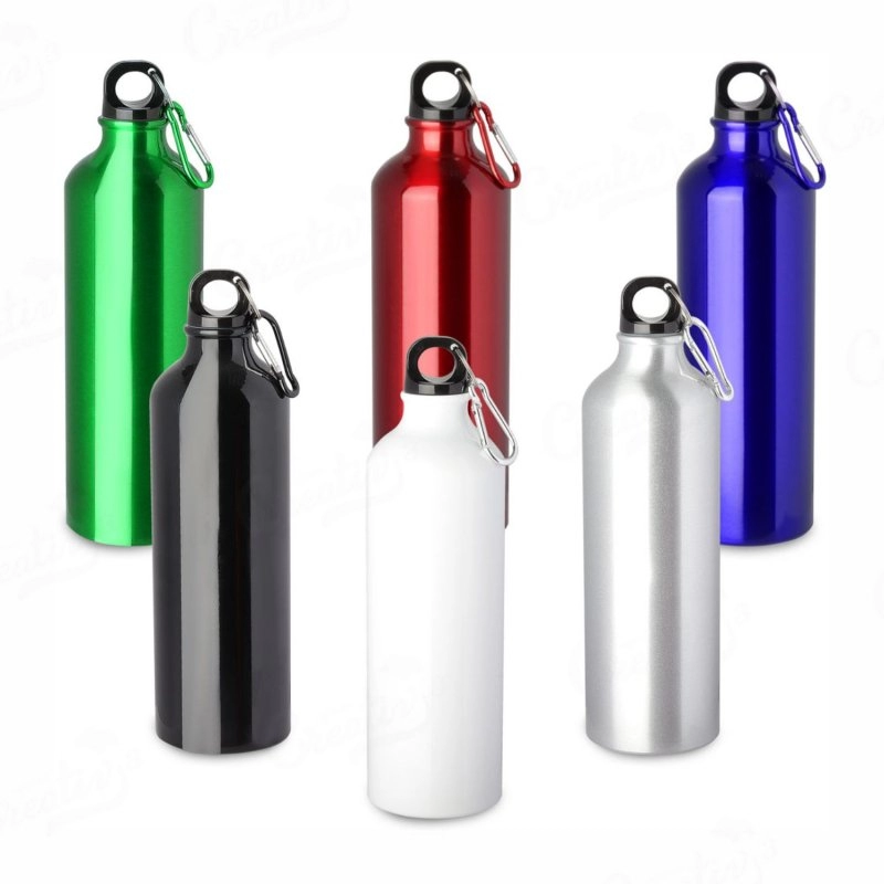 Garrafa em alumínio, tampa de plástico com mosquetão colorido. Capacidade de 750ml, com pintura metálica.