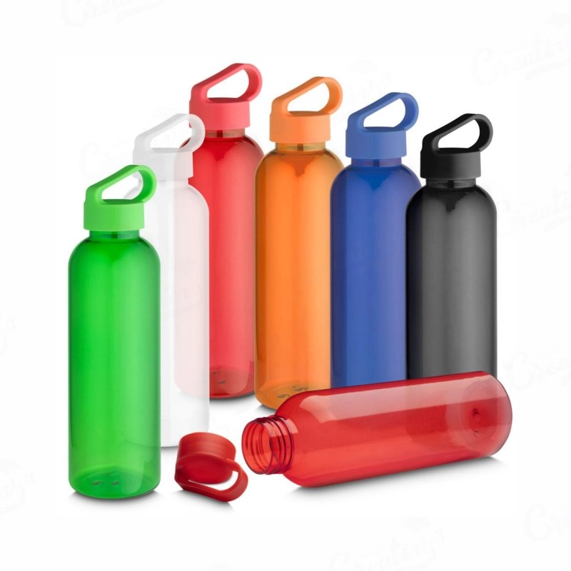 Garrafa *RPET com capacidade de até 550ml, tampa plástica com alça integrada.