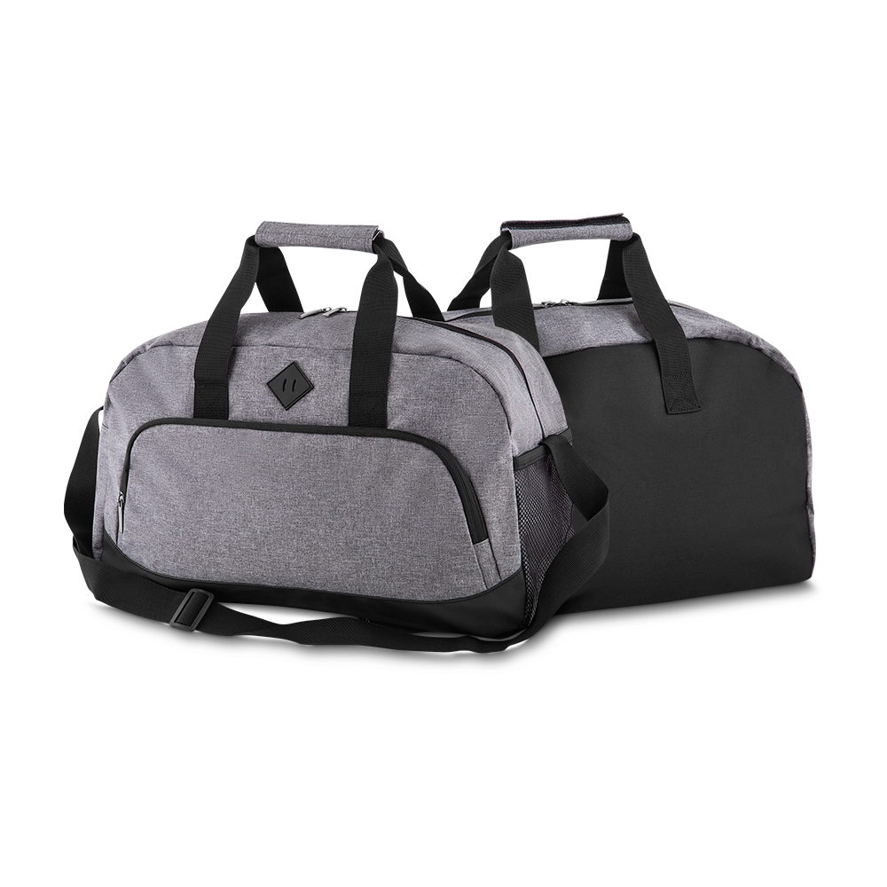 Mala esportiva em Poliéster com alça de mão e ombro. Bolso frontal e lateral.